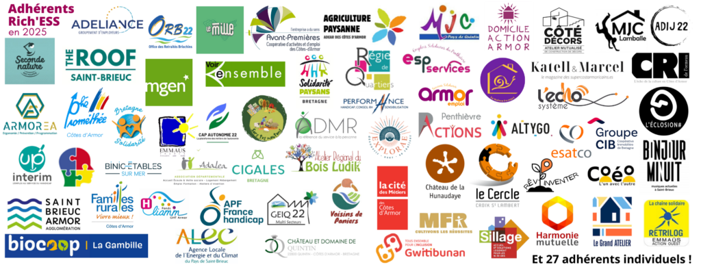 Rich’ESS regroupe 95 structures (associations, coopératives, mutuelles, collectivités, entreprises) et personnes physiques du Pays de Saint-Brieuc. La force du réseau est la richesse de ses statuts et la variété de ses projets.